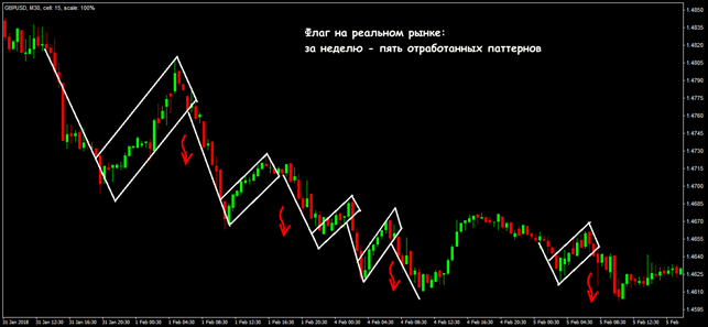 При формировании горизонтального Флага («Прямоугольник») сила сигнала при пробое будет средней, и работать с таким паттерном нужно по методике обычного пробоя флета.