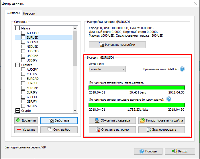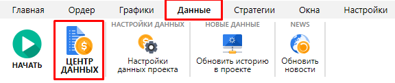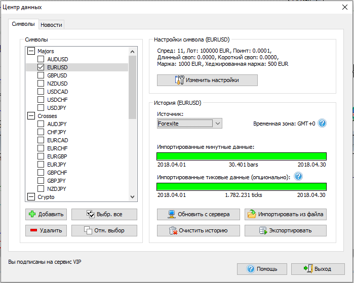 Центр обработки данных служит для управления историей котировок. Здесь Вы можете: