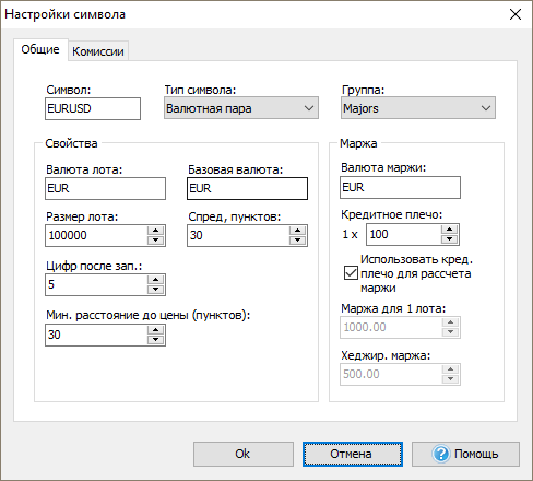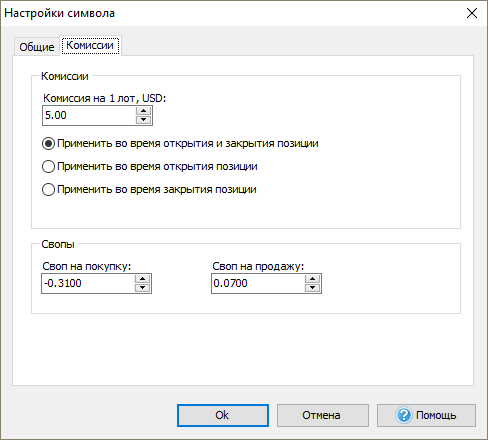 В диалоговом окне Настройки символа Вы можете увидеть вкладки Общие и Комиссии.