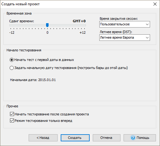 Используйте ползунок “Сдвиг времени” для выбора часового пояса исторических данных. Этот часовой пояс будет применен к выбранным парам для тестирования. По умолчанию выбран GMT+0.