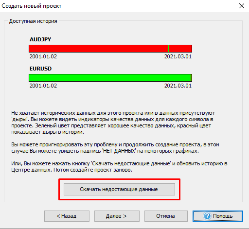 Если за какой-то промежуток времени у Вас в проекте не будут совпадать данные, он будет отмечен красным цветом. В этом случае Вам необходимо будет Скачать недостающие данные для необходимой валютной пары.