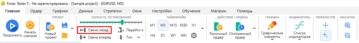 Перемещайтесь на один бар назад при каждом нажатии на клавишу Backspace на клавиатуре или при нажатии на кнопку “Свеча назад” на панели инструментов.