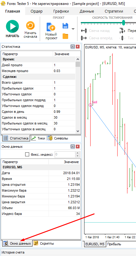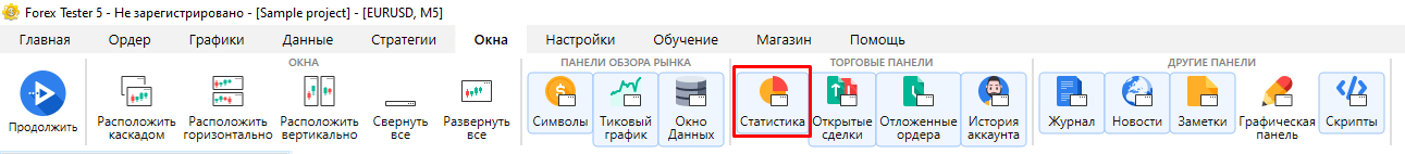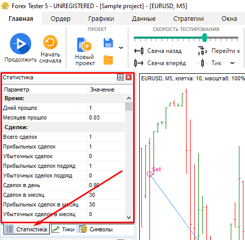 Чтобы проанализировать результаты тестирования, перейдите на вкладку Статистика в окне с информацией о рынке, расположенном в верхнем левом углу возле графика.