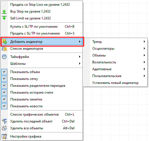 Кроме того, Вы можете кликнуть правой кнопкой мыши на графике и выбрать «Добавить индикатор».