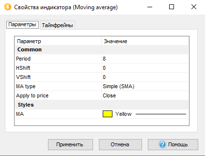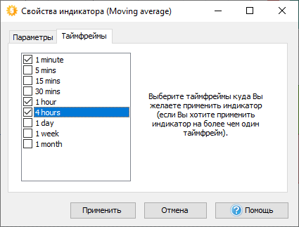 Обратите внимание, что выбрать необходимые таймфреймы для отображения индикаторов можно только при добавлении индикаторов.