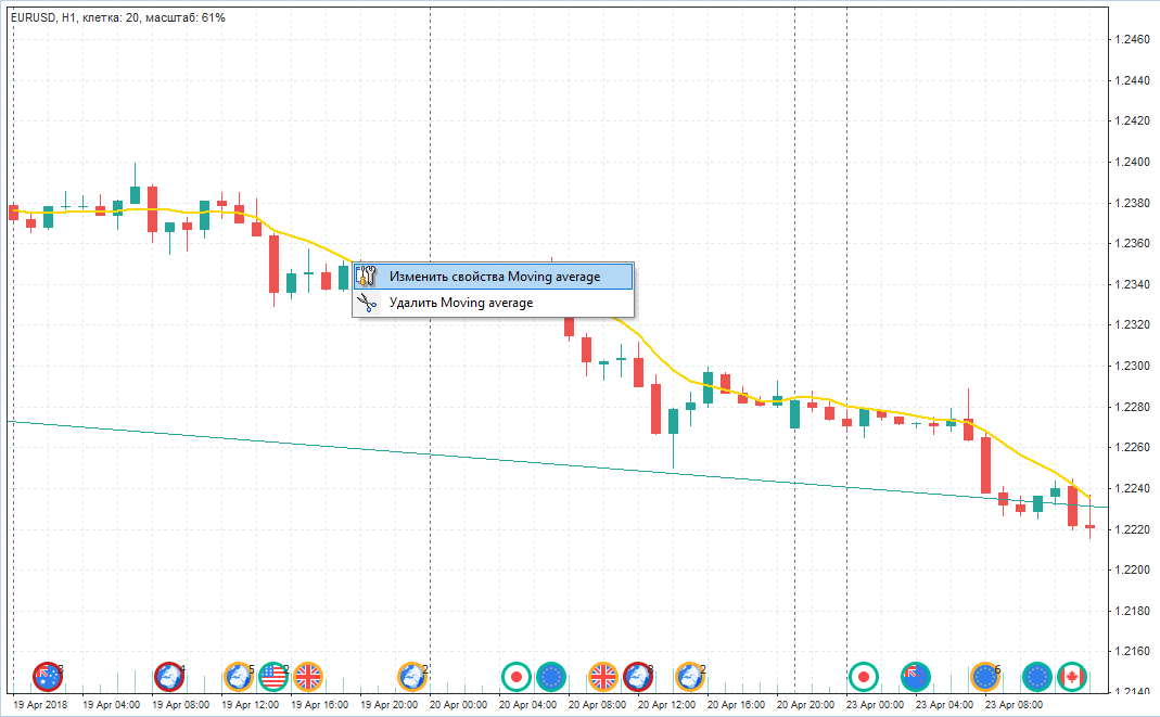 Вы можете отредактировать свойства индикатора (в этом случае выберите опцию «Изменить свойства…») или удалить его из графика («Удалить…»).