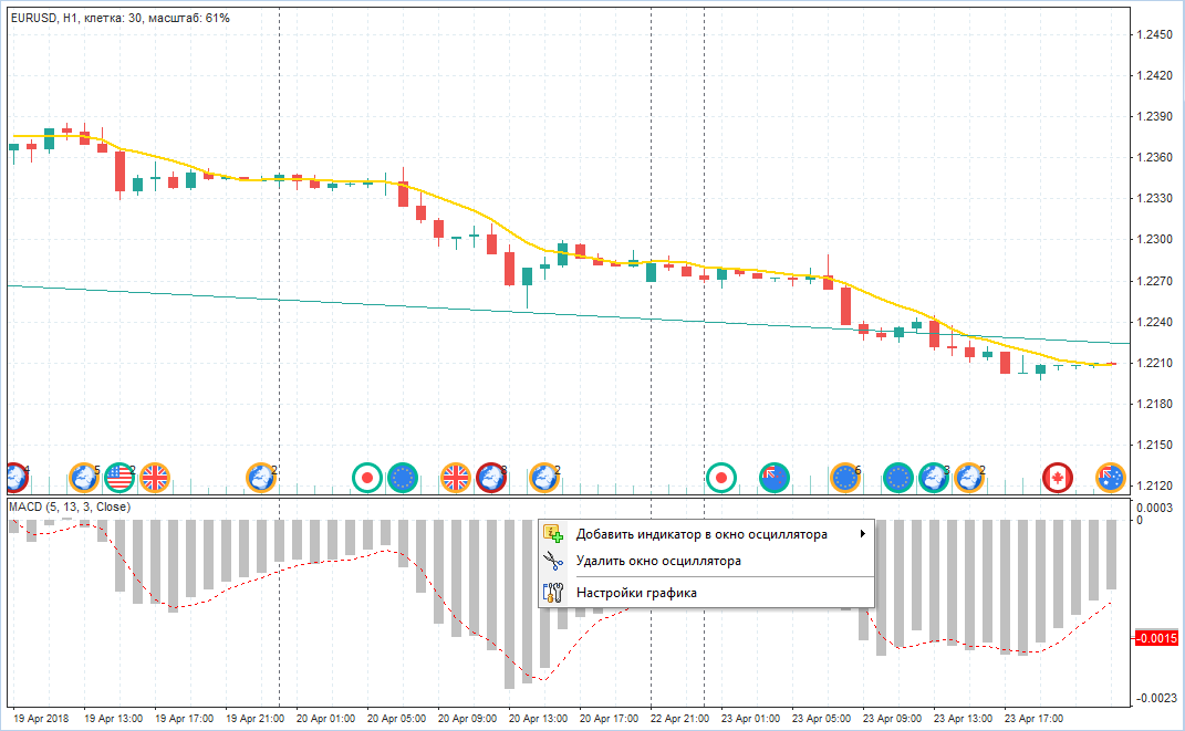 Вы можете объединить больше одного индикатора в окне осциллятора. Нажмите правой кнопкой мыши на окне осциллятора и выберите «Добавить индикатор в окно осциллятора». Когда Вы удалите окно осциллятора, все другие индикаторы в этом окне будут также удалены.