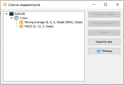 Здесь Вы можете редактировать свойства индикатора, удалять индикаторы, или удалить все индикаторы на всех графиках сразу.