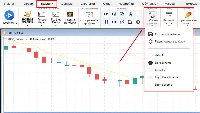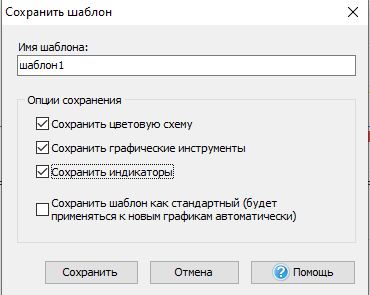 2. Выбрать Шаблоны → Сохранить шаблон, или нажать правой кнопкой мыши на графике и выбрать Шаблоны → Сохранить шаблон: